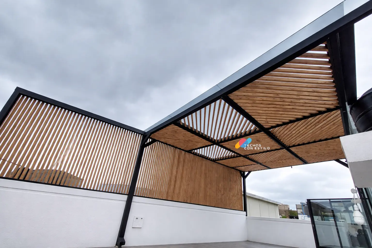 Aluminio imitación madera, acero y cristal templado se integran para crear estructuras elegantes y duraderas, pensadas para elevar el valor y la experiencia de tu espacio exterior.